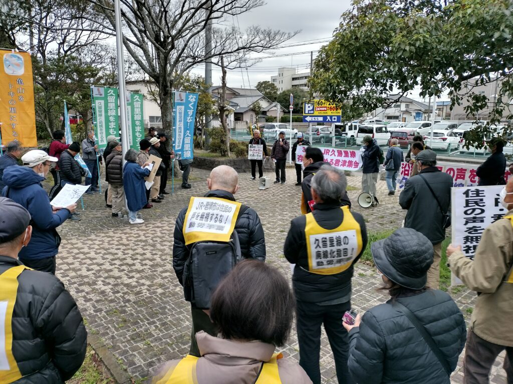 かずさ住民の足を守る会の代表からは、「JRは18年で20億円を出すと言っているが、バス運行や展望を含め何も明らかになっていない」として、JRと君津市の対応を弾劾した。さらに亀山地区の住民や袖ケ浦市在住の市民からの発言を受け、集会参加者は、君津市役所に向けてデモ行進を行った。デモ行進では、「久留里線の廃線を許さないぞ!」「JRは公共交通の使命を果たせ!」「国はJRの廃線申請を認めるな!」「市長は住民に説明しろ!」の声を響かせた。